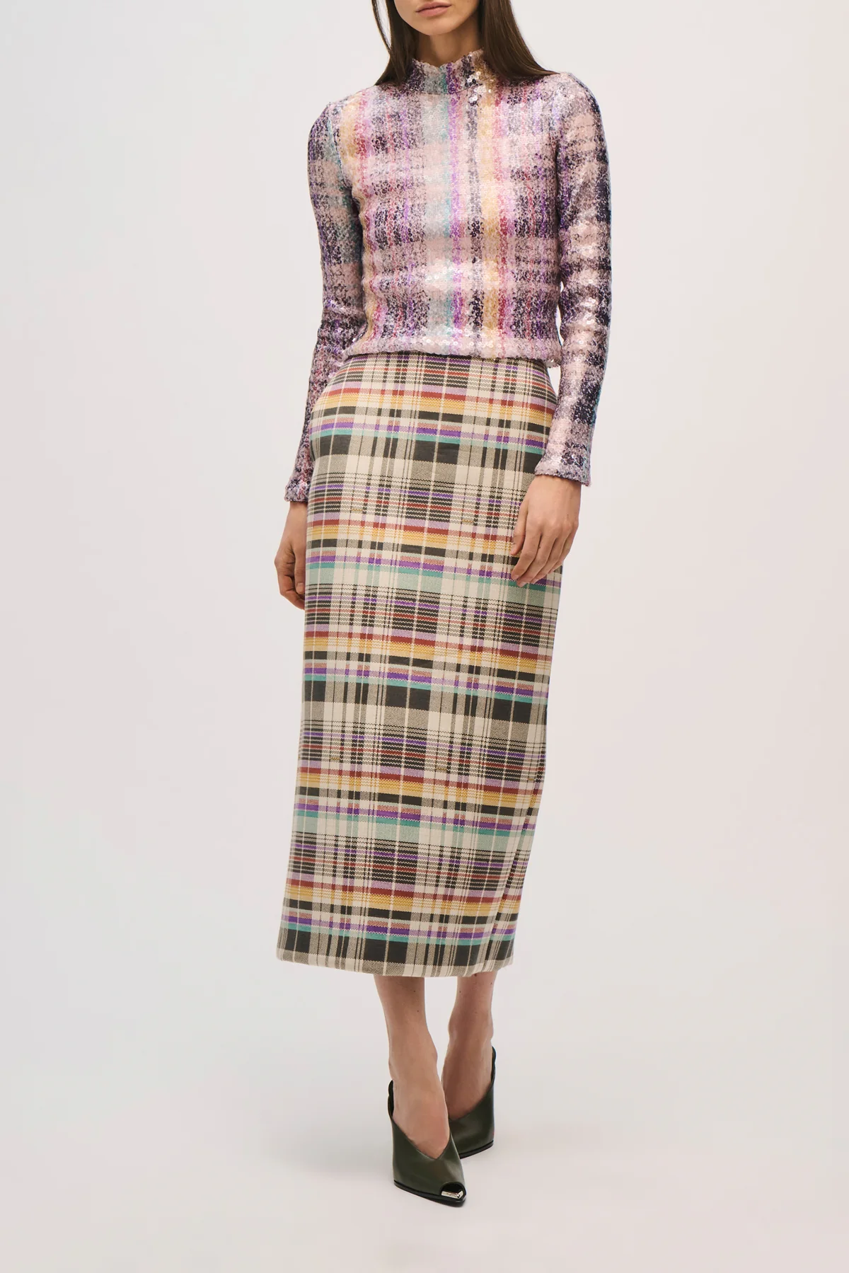 A long sleeve top embellished with glossy sequins in a graphic plaid motif, hand-drawn and scaled to proportion. Cut in a sleek, close silhouette with a high neckline, it’s designed with a cropped fit. Stretch mesh lining allows ease of movement, balancing shine with refined structure.