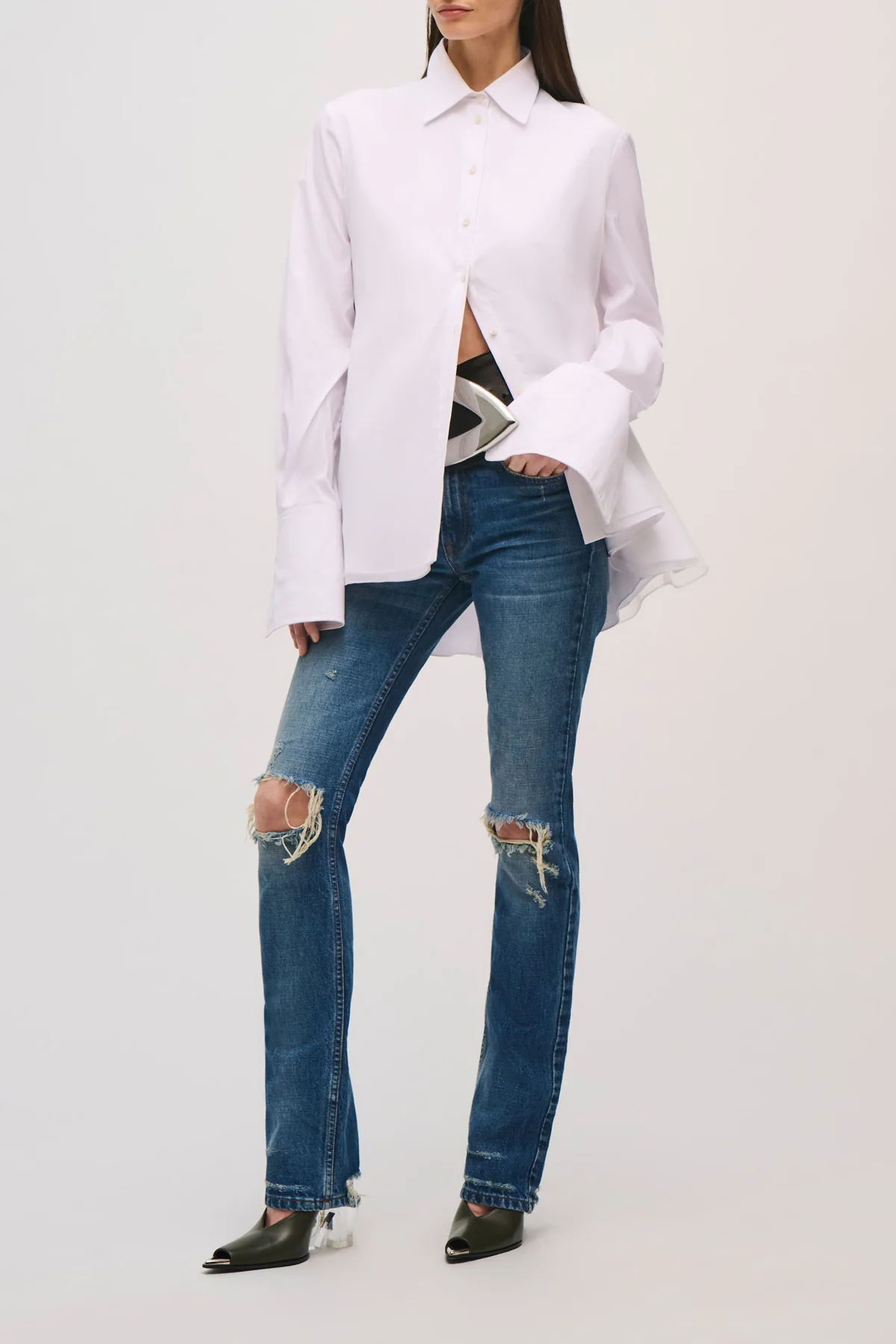 A modern interpretation of trapeze tailoring, this layered shirt is designed with subtle volume and movement. Cotton poplin, organza, and tulle build soft structure through the body, while the sleeves remain lightweight for balance. It reimagines classic shirting through a clean, architectural lens.